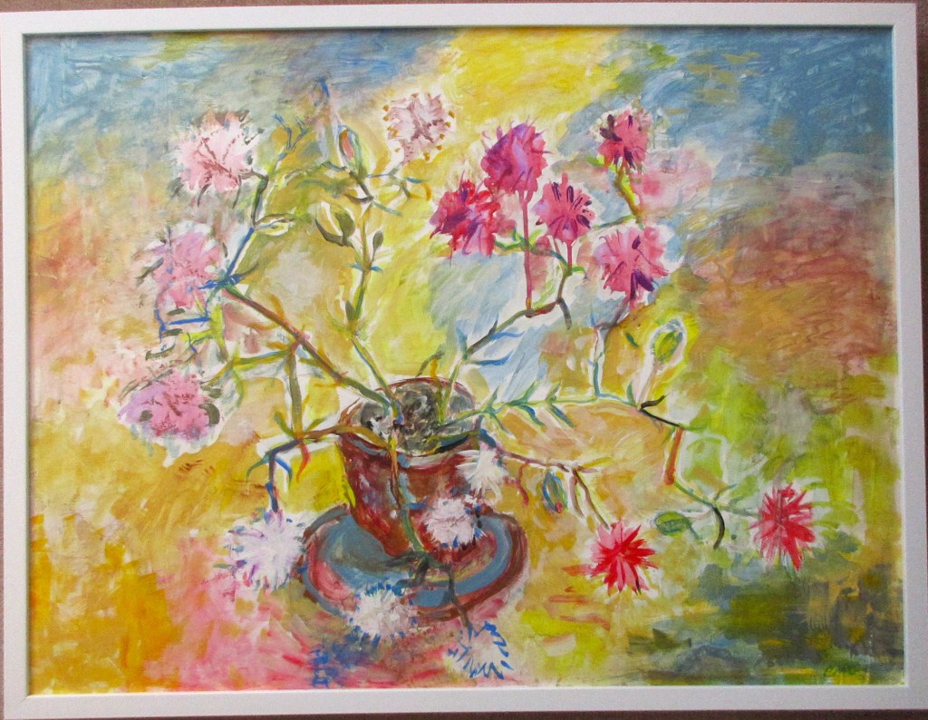 Stepped Petunias framed, acrylic on backing board, 940mm x 770mm, $725