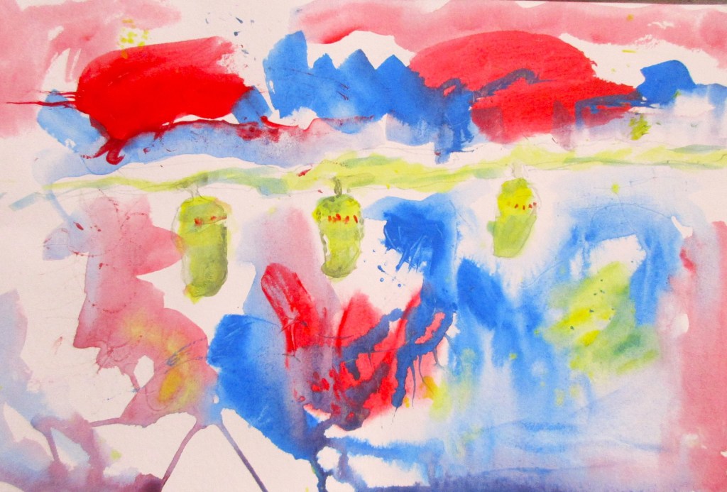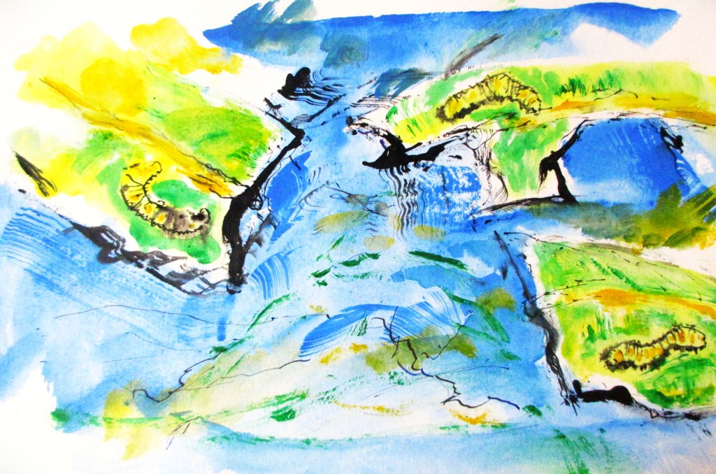 A cloud helped me get started – there was a beautiful swan shaped cloud which seemed to be diving towards the earth; and with its soft edges it was easy to imagine leaves and stems as well. So with wet paper, acrylics and inks I was away. The twelve requested works developed slowly but steadily.