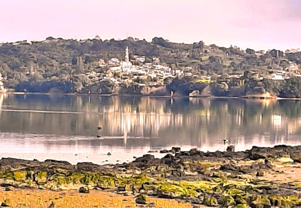 On that unforgettable wild day in Āwhitu Regional Park which is part of the Manukau Harbour I also worked over an old lithograph to paint two black oyster catchers against an island backdrop. Now when I look at it again, to my surprise, there is a taniwha behind them!