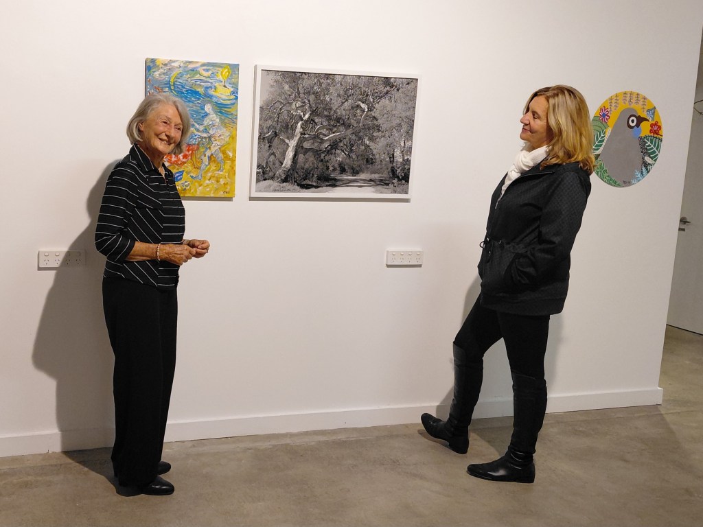 Myself and fellow artist Agnes Desomblaux-Sigley standing in front of our works. My painting “The Absence” and Agnes’ black and white photograph titled, “Red River Gum – photo by Marion Gordon-Flower