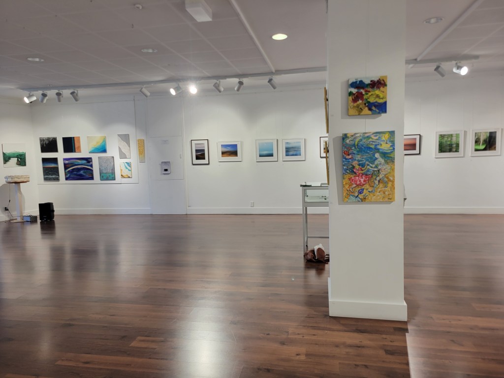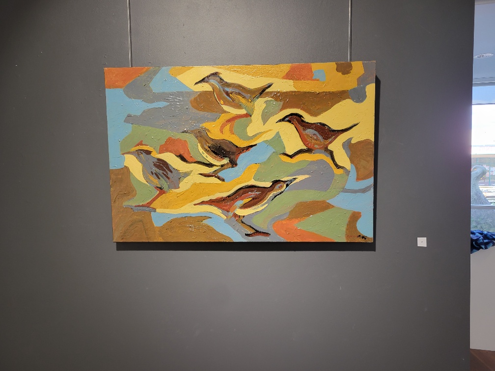 My two paintings on the column in the foreground. “Oystercatchers” at the top. “The Absence” below 600mm x 420mm Acrylic on stretched canvas.